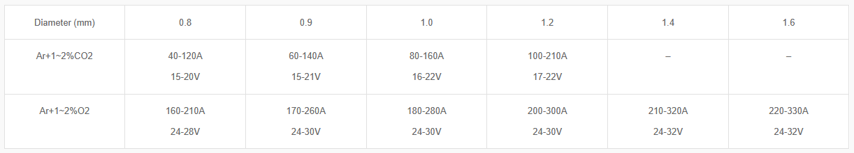 - Use Ar+1~2%O2 for spray transfer and Ar+1~2%CO2 for short-circuit transfer.