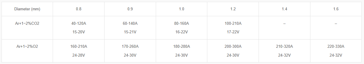 - Use Ar+1~2%O2 for spray transfer and Ar+1~2%CO2 for short-circuit transfer
