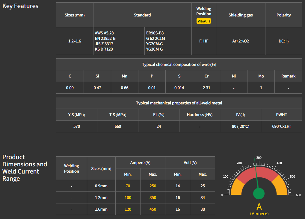 For butt and fillet welding of power stations, heat exchanger and oil refineries such as 2.25%Cr-1%Mo heat-resistant steel