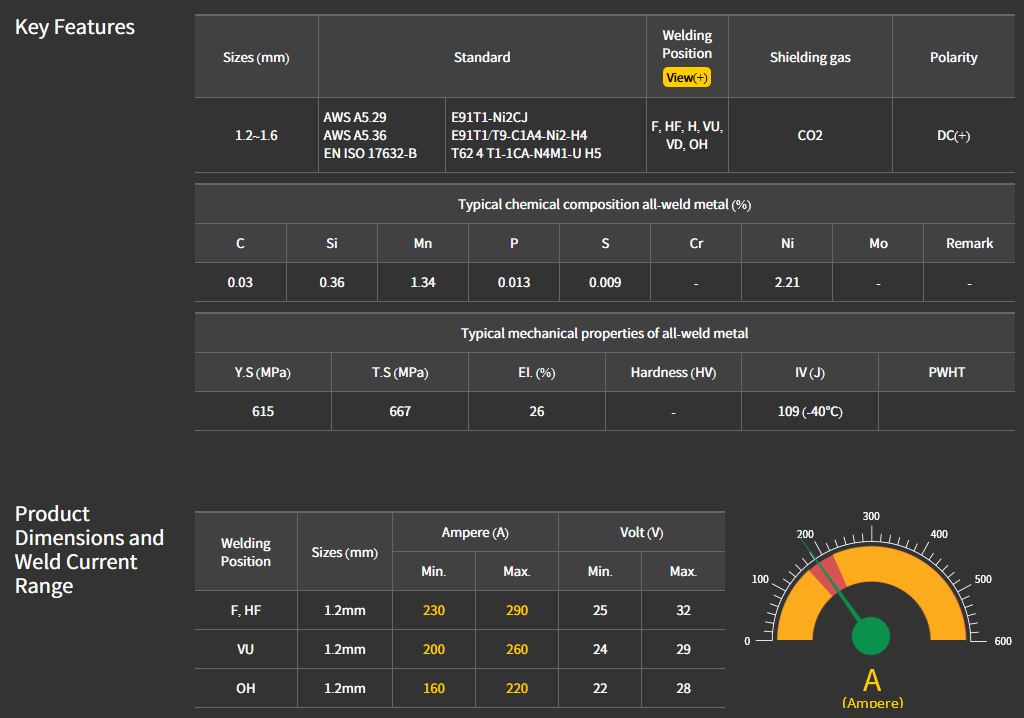 - AWS: A5.36 : E91T1/T9-C1A4-Ni2-H4