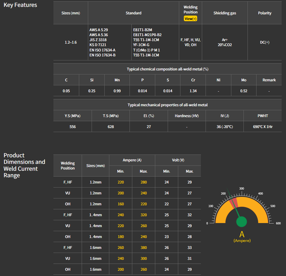 - EN: ISO 17634-A : T (CrMo 1) P M 1