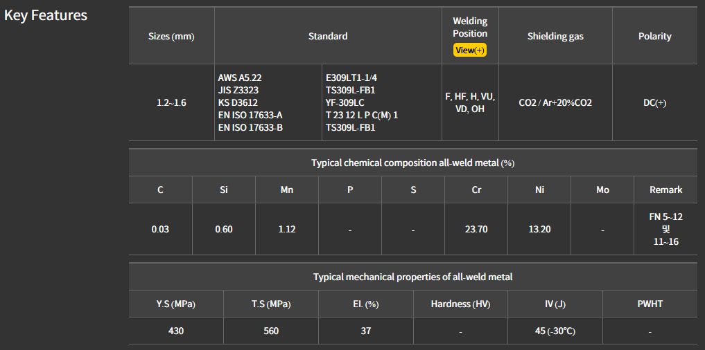 - EN: ISO 17633-B : TS309L-FB1