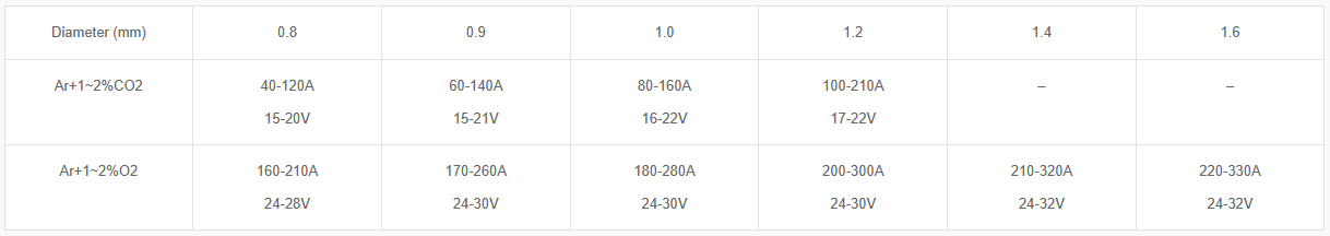 - Use Ar+1~2%O2 for spray transfer and Ar+1~2%CO2 for short-circuit transfer.