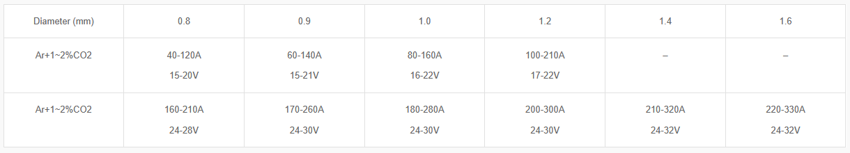 - Use Ar+1~2%O2 for spray transfer and Ar+1~2%CO2 for short-circuit transfer.